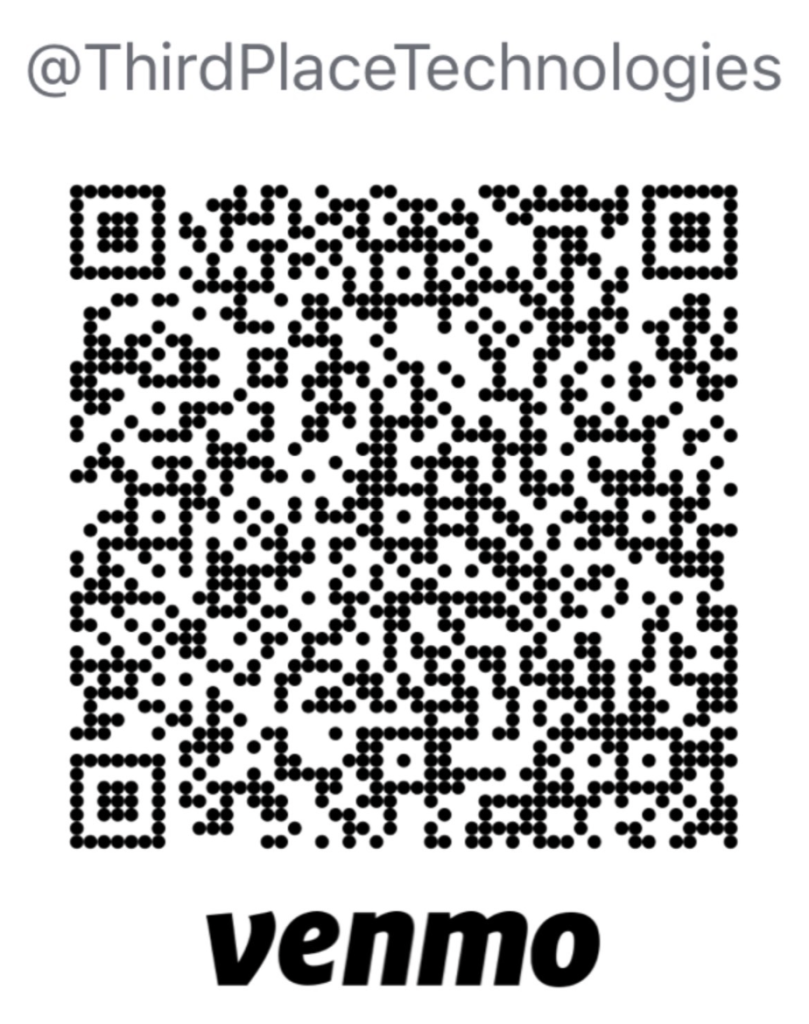 Donate to us via Venmo to @ThirdPlaceTechnologies, or using the QR code to the left. We cannot thank you enough even for a the smallest donation to help!